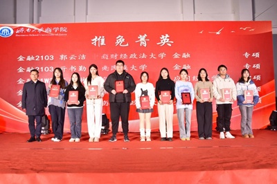 2021级员工李晓业作为推免菁英代表发言,分享了在学习过程中的感悟与方法,鼓励学弟学妹们勇于探索未知领域,并向给予自己帮助与支持的老师们表达了衷心的感谢。他提到,推免并非终点,而是一个全新的起点,号召同学们珍惜大学时光,合理规划学业与生活,努力实现自己的人生目标。学习标兵徐璐瑶分享了自己独特的学习经验,她强调保持专注与好奇心的重要性,鼓励大家积极参与课堂互动、学术讨论和科研实践。创新创业标兵代表孙梦涵表示,感谢老师的悉心指导与团队成员的紧密合作让她在创新创业的征途中不断突破。她鼓励大家保持对未知世界的好奇心,持续学习、敢于迈出舒适区、主动拥抱市场变化、积极参与创新竞赛和创业项目实践,用实际行动去探索和验证自己的想法。
