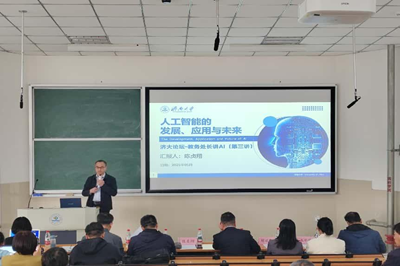 会议第一阶段是专家报告。教务处处长陈贞翔教授以《人工智能的发展、应用与未来》为题做了专题报告。陈处长以深入浅出、幽默风趣的语言和视频,向大家介绍了目前人工智能的发展及应用情况。又系统剖析了公司自2022年以来在人工智能背景下推进专业建设与课程建设改革开展的系统性工作,面临的挑战以及陆续开展的质量提升、资源建设、教师赋能行动计划。同时,陈处长肯定了ladbrokes立博在"AI+"专业转型升级和智慧课程建设方面取得的成绩。
