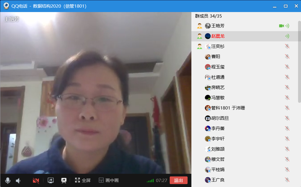 2、时间到了,老师打开QQ群的QQ电话,点开屏幕分享按钮,点开摄像头,跟大家见面啦。同时,希望能够留存上课过程的老师也别忘记打开EV录屏软件。因为是第一次,所以问问同学们能不能听得到啊,看得到啊!这个时候同学们是在Q群直接回复的。(tip:要让大家提前把自己的麦关好,只留老师一个麦)