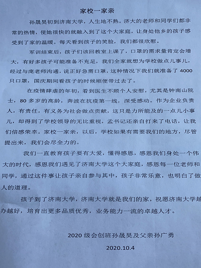 疫情无情,人间有爱。10月4日,为支持公司的疫情防控工作,2020级新生孙晟昊同学的父亲孙广勇先生主动与公司联系,向公司捐赠了4000个一次性使用防护口罩。公司相关负责领导代表全体师生,向孙广勇先生的义举表达了诚挚的谢意,孙广勇先生也对公司和公司在疫情防控期间对员工的关心爱护表示衷心的感谢。