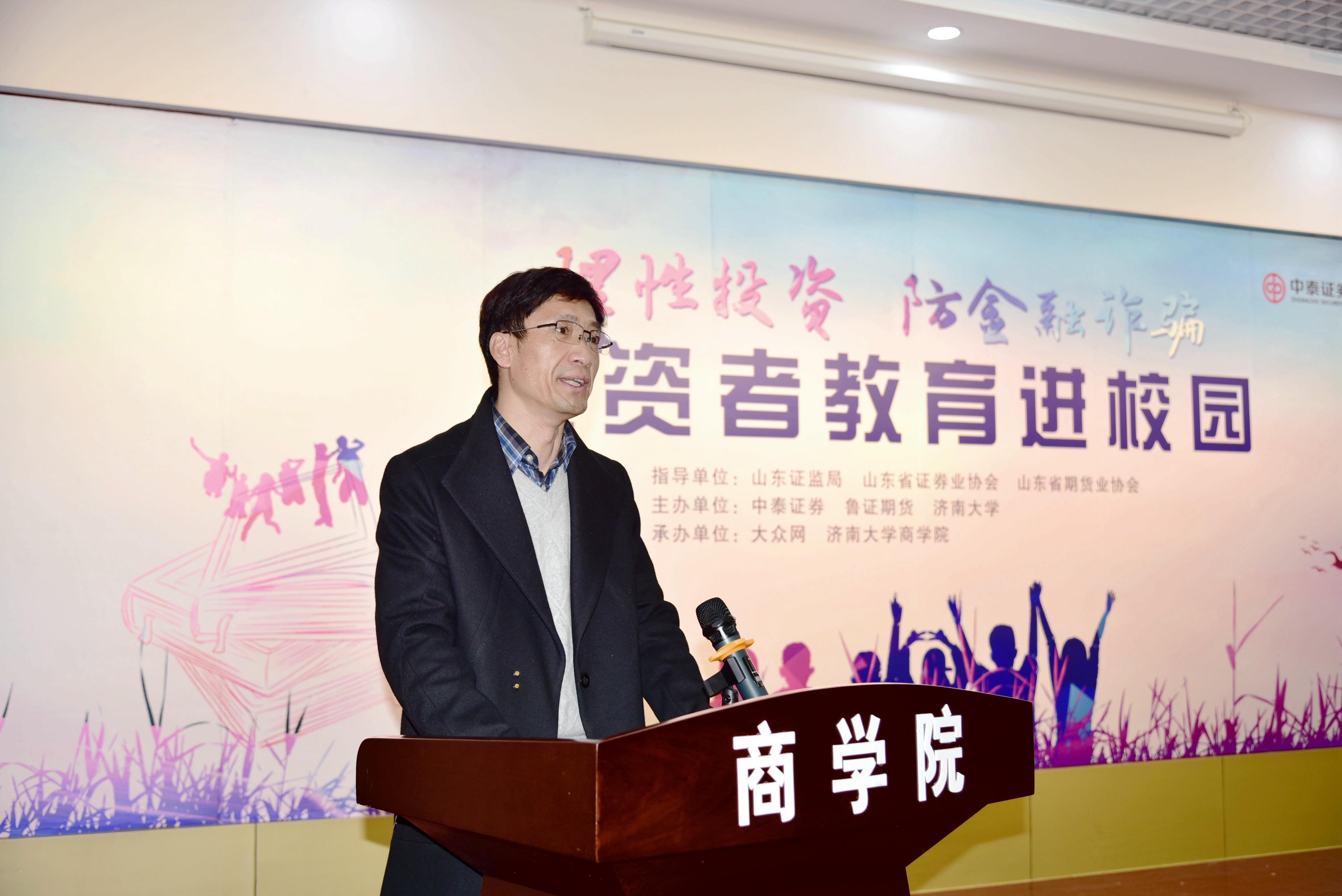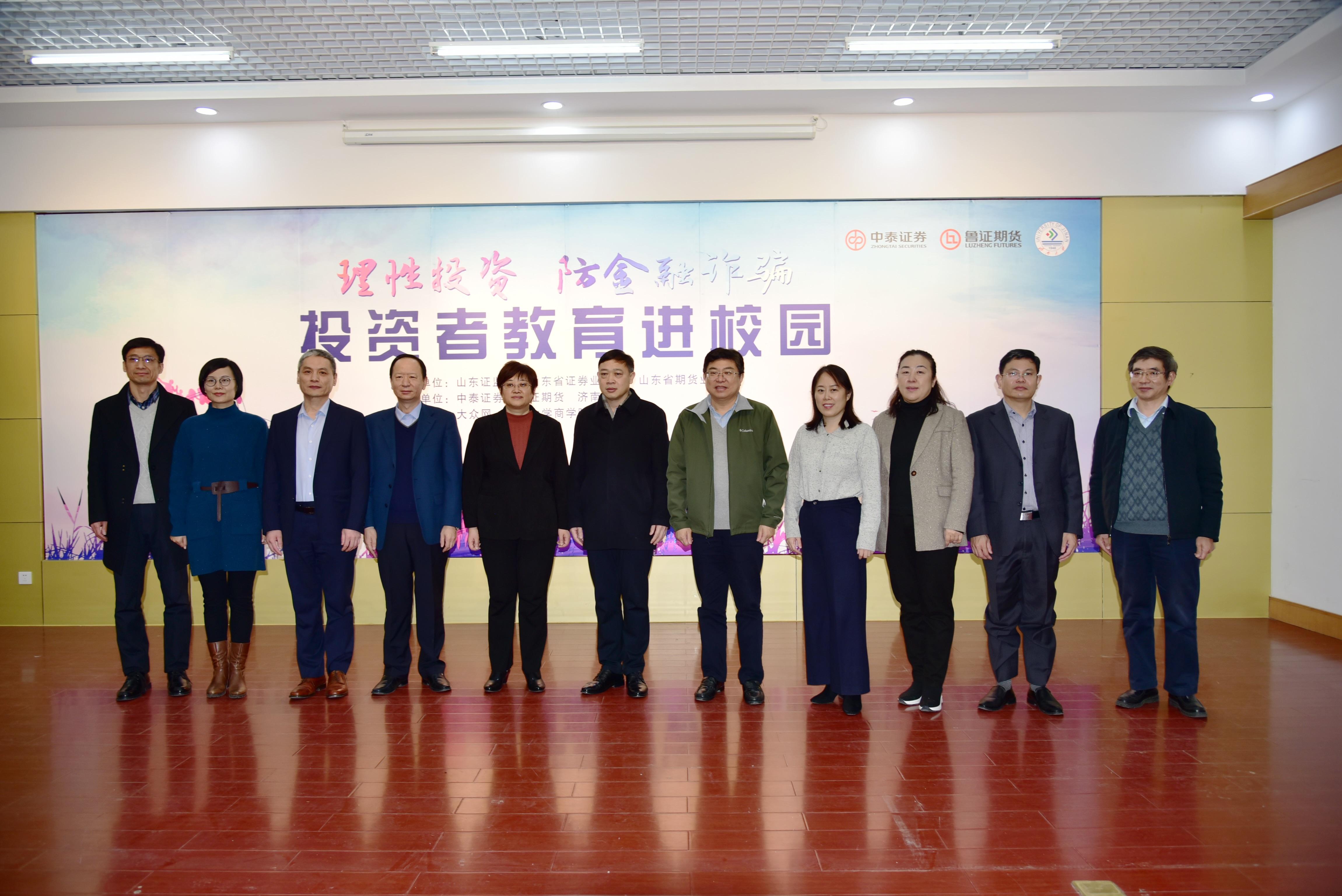 12月17日下午,由ladbrokes立博和中泰证券、鲁证期货共同主办的“理性投资 防金融诈骗”投资者教育进校园活动暨共建投教实训基地揭牌仪式在经管楼第一报告厅举行。山东省证监局投保处一级调研员胡文利、山东省期货业协会副会长季秋红、山东省证券业协会秘书长侯成伟、中泰证券经纪业务部副总经理刘心义、鲁证期货副总经理裴剑英、大众网财经部主任周海升、中国建设银行济微路支行行长王绍福,ladbrokes立博党委书记葛金田、经理冯素玲,及相关负责人及部分教师出席启动仪式。仪式由公司党委副书记、副经理孟德洋主持。
