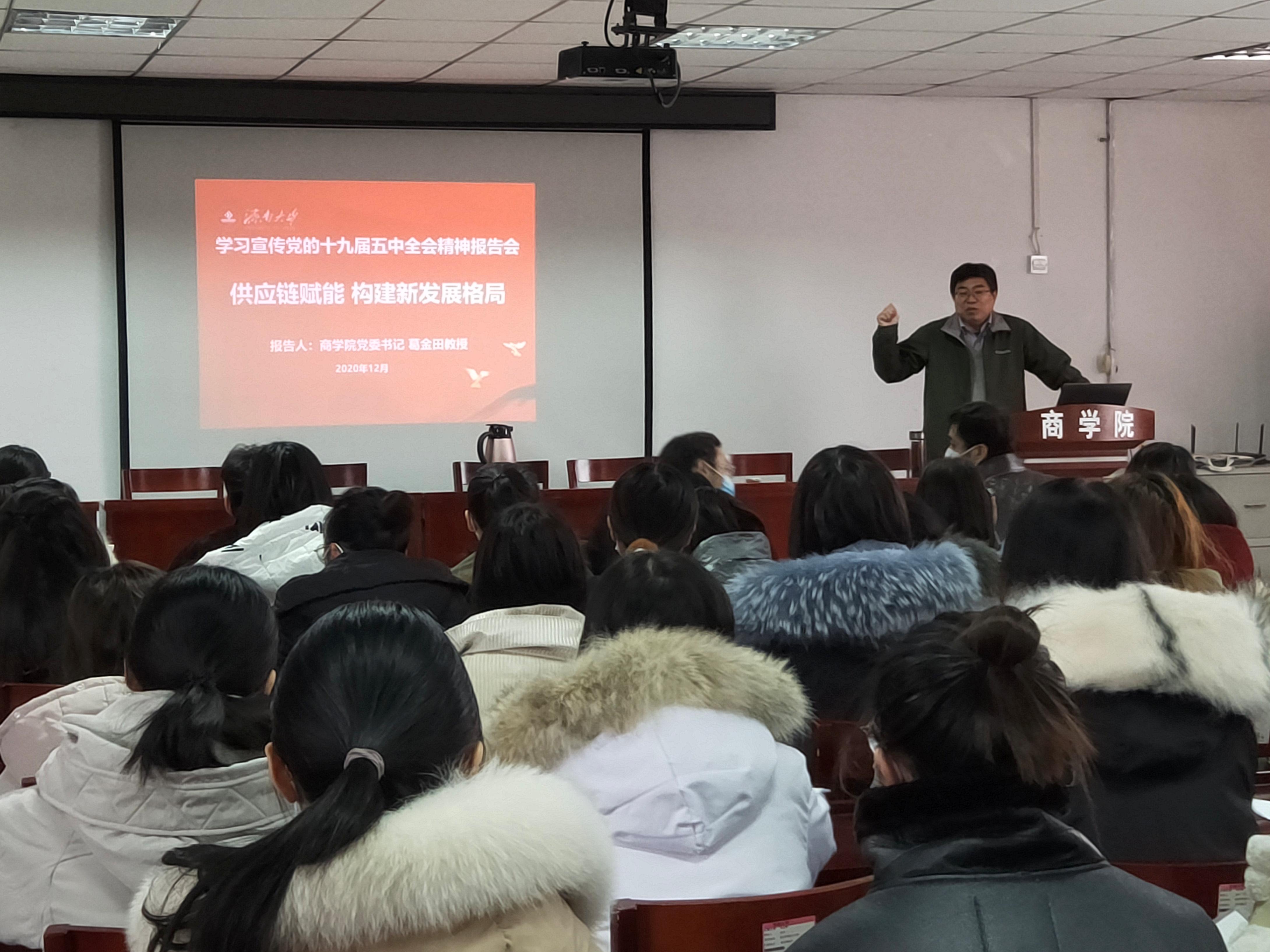 葛金田书记以“凝心聚力再出发,砥砺奋进新征程”为主题,围绕四个把握,即把握党的十九届五中全会精神内涵、把握中国经济社会发展面临的新环境、把握科学分析互联网时代经济发展新特征,以及把握供应链赋能加快构建双循环新发展格局四个关键点展开宣讲。葛书记指出,在百年未有之大变局、百年未有之大疫情、百年奋斗目标等三大背景下,数字化、大国博弈、治理重构等进一步推动社会加速变革,世界经济格局将深刻调整。他强调,在党的十九届五中全会精神的指导下,我们要结合公司实际展开工作,认真做好理论阐释和学习培训,同时,时刻保持对国内外经济形势的敏感度,准确把握国内外经济新形势,正确认识互联网时代中国经济发展新特征,进一步把握好理论研究和学习的正确方向。要求同学们要加强党的十九届五中全会精神学习,做到学深悟透,要以多途径、全覆盖、深内涵的工作思路开展学习研讨活动,经常性地谈心得、讲体会、学落实;要求同学们要统筹兼顾,把学习贯彻全会精神与各自专业相融合,服务社会经济建设,为国家多做贡献。