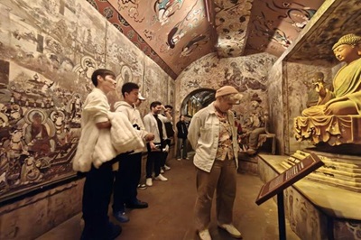 活动突破传统英语角场地限制,构建全程英语交流场景。登山途中,协会成员用英语讲解山体地貌与人文历史;参观四窟万像时,员工以英语介绍石刻造像的艺术价值与历史渊源,外教实时互动提问,形成沉浸式语言实践氛围。