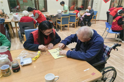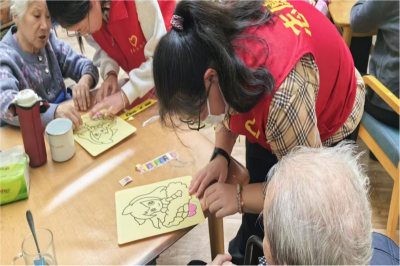 活动当天,志愿者们抵达护理院,在进行简短的培训后,迅速布置好活动场地,完成了沙画材料的准备与摆放。活动中,志愿者们采用“一对一”的陪伴模式,耐心逐步讲解示范,协助老人们选色、撒沙、固定,与老人一起共同完成作品。