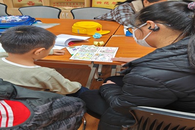 图5 志愿者和基地小朋友一同观看作品 图6 志愿者将作品带给小朋友