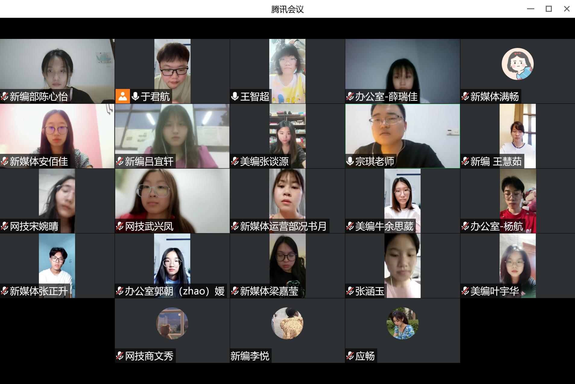 会议开始,于君航同学梳理总结了中心近期开展的各项重点工作和完成进展情况,对下一步各部门的工作任务进行了安排部署。随后,新媒体运营部、新闻编辑部、办公室、网络技术部和美文采编部五个部门新一届负责人逐个介绍了所属部门的主要职责和近期工作计划,围绕“信息中心建设、活动组织开展、技术学习提升、履职担当尽责”等方面谈了谈看法、说了说感悟,提出了很多有价值的意见和建议。