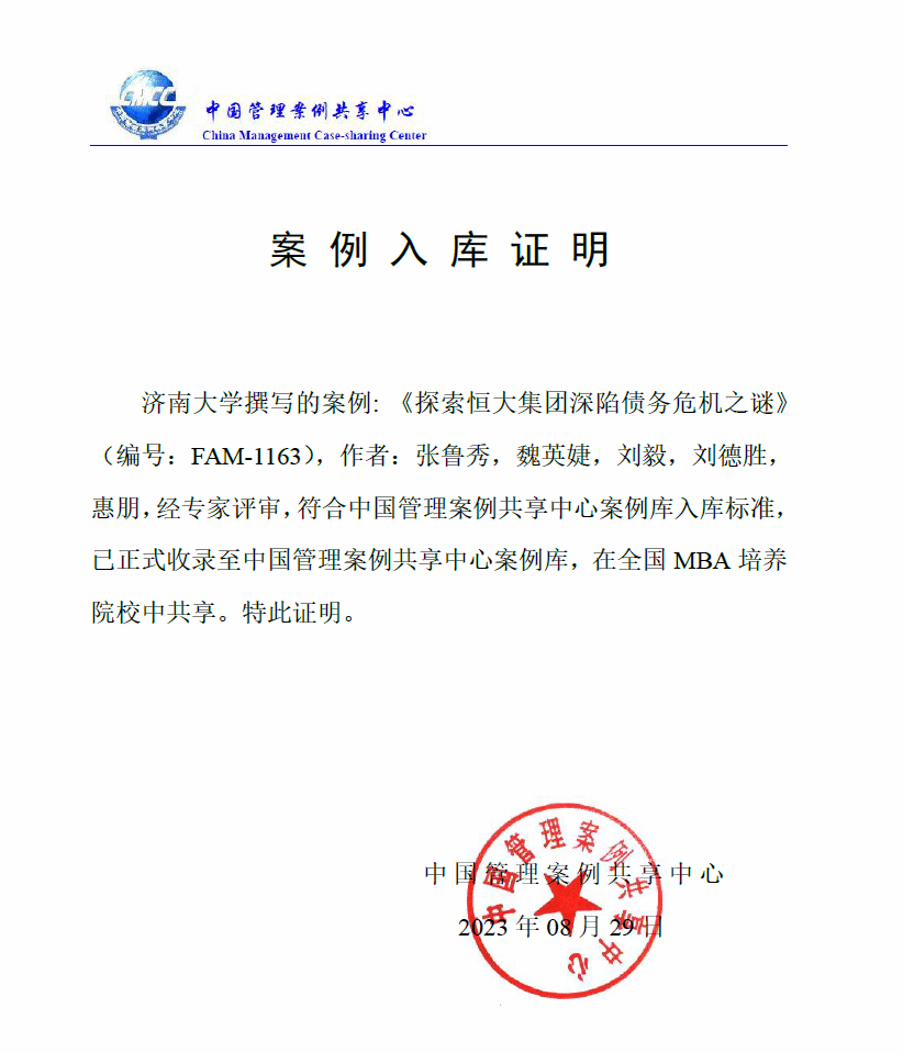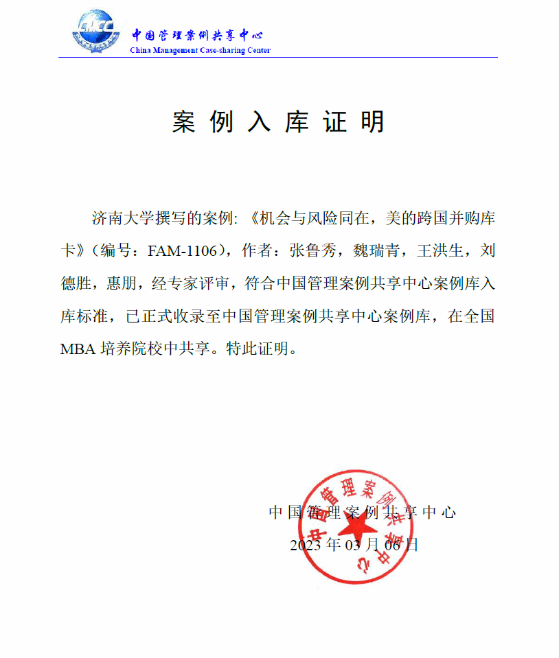 近日,公司张鲁秀教授团队撰写的案例《探索恒大集团深陷债务危机之谜》、《机会与风险同在,美的跨国并购库卡》已正式收录至中国管理案例共享中心。