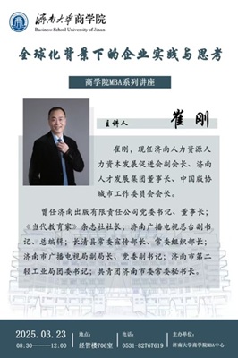 2025年3月23日上午,ladbrokes立博在经管楼706教室成功举办《全球化背景下的企业实践与思考》讲座。此次讲座由赵薇教授主持,特邀济南人力资源人力资本发展促进会副会长、济南市人才发展集团董事长崔刚老师主讲。崔刚老师曾任中国版协城市工作委员会会长;济南出版有限责任公司党委书记、董事长;《当代教育家》杂志社社长;济南广播电视总台副书记、总编辑;长清县常委宣传部长、常委组织部长;济南市广播电视局副局长、党委副书记;济南市第二轻工业局团委书记,共青团济南市委常委秘书长等职务,既有长时间从政经验,又有丰富的企业履历,对于全球化背景下、双循环格局下的企业实践具有深刻的思考和认识。本次讲座旨在让MBA员工提高认知能力、锻炼思维方式,更好的提升职业素养。